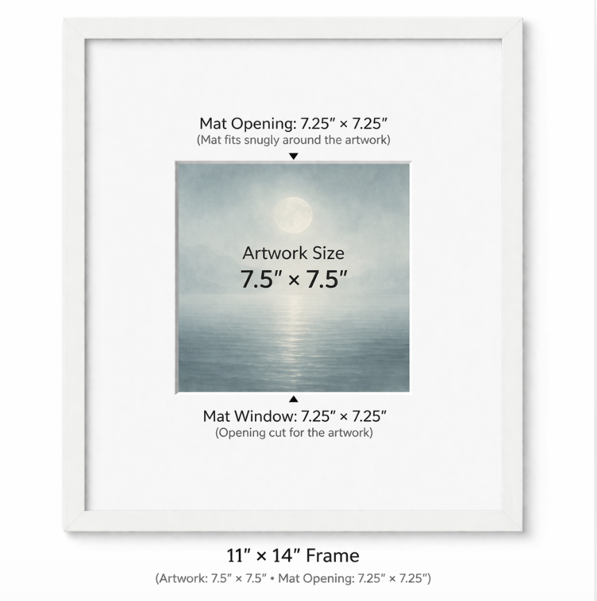 Use a white mat with an opening of approximately 7.25 × 7.25” for a refined, gallery-style presentation.